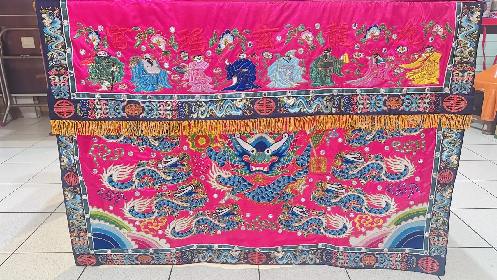 九龍護持、萬靈歸宗。這份桌圍不僅是工藝品,更是信眾對神明虔誠的體現。感謝玄瑤宮的信任,讓我們能以針線傳遞這份信仰的重量。