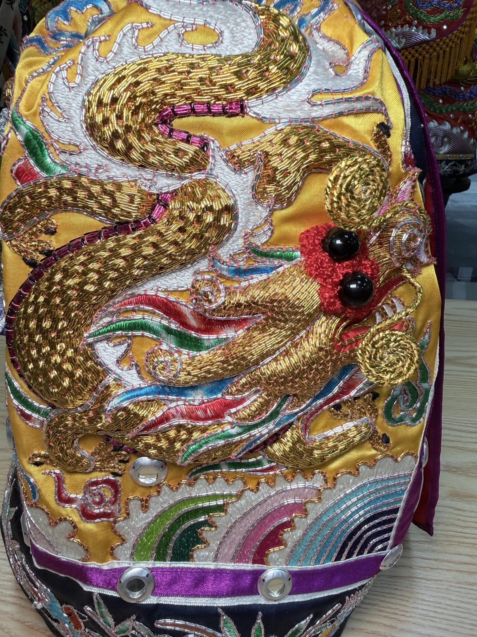 金龍盤踞、祥雲繚繞, 刺繡層層堆疊出莊嚴威儀。